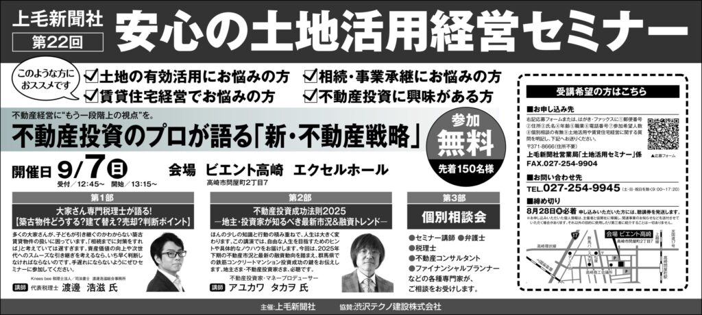 こちらのセミナーは上毛新聞社様主催で毎年9月に開催しており、毎年100名OVERのお客様にご来場いただいております!毎年お越しいただいているお客様も、初めてのお客様も是非お気軽にご参加ください!!
